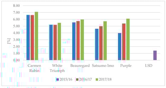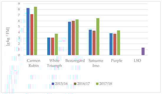 A significant increase in total sugars was recorded in the ‘Carmen Rubin’ and ‘Satsumo Imo’ cultivars in storage season 2017/2018 as compared to seasons 2015/2016 and 2016/2017 (Figure 3).