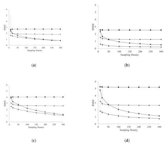 Mean RMSE of soil ESP predictions over 10 simulations at depths 0–10 cm (a), 10–20 cm (b), 20–40 cm (c) 40–60 cm (d) for the 4 sampling methods investigated. Error bars represent 2 standard deviations of the RMSE range for 50 simulations for each sampling density (x samples/108 ha).