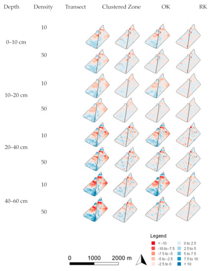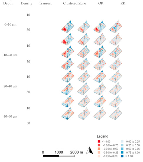 Prediction error maps for soil pH and ESP are displayed in Figure 8 and Figure 9, respectively. The spatial errors are of a higher magnitude at low sampling densities in the surface layer for pH, and the 40–60 cm layer for ESP. This agrees with the RMSE results of each prediction. The errors for both pH and ESP are spatially correlated, meaning that the areas of large error are generally spatially consistent across sampling methods and densities for a given depth. For example, this is seen in the 0–10 cm layer for soil pH, where all methods severely under-predicted values in the region to the south-west of the site, which correlates with zone 3 identified by k-means clustering. The spatial distribution of errors for the RK method, however, did not always agree with the other methods. This is seen in the 20–40 cm depth layer for ESP. Here, the higher magnitude errors are less spatially correlated and occur in smaller, more spatially irregular pockets in comparison to other methods.