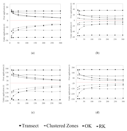 Error trends of gypsum and lime recommendations, based on the spatial predictions, generally agreed with that of the RMSE findings (Figure 10 and Figure 11). At all sampling densities, RK produced lower magnitude errors in under- and over-application of amendments. The magnitude of application error for the OK and RK decreased with increasing sampling densities, with errors remaining relatively consistent for the clustered zone and random transect methods. Interestingly, small changes in RMSE of ESP and pH predictions translated to large recommendation errors, in terms of both under- and over-application. This suggests that the accuracy of amendment recommendations are highly sensitive to small changes in spatial prediction performance.