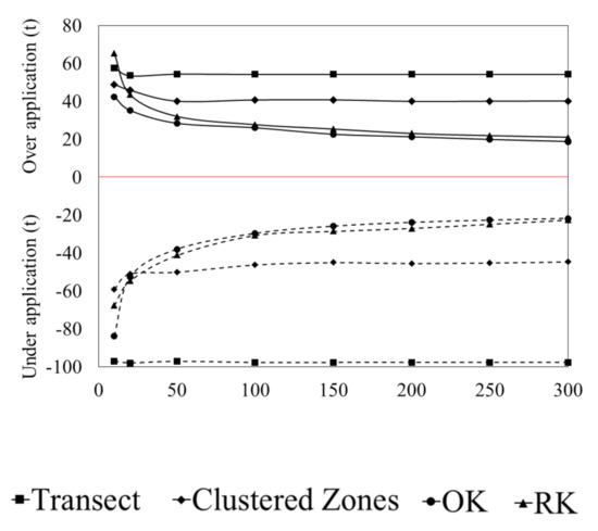 The most accurate applications of gypsum and lime were achieved using a variable-rate approach, based on an RK spatial prediction method. This was achieved over all the sampling densities. Whilst traditionally it was been recommended that neither RK or OK should be applied at such low densities [30], we have shown here the importance of assessing prediction errors practically by evaluating the accuracy of resulting land management decisions to determine acceptable sampling requirements. Whilst it is important to investigate the statistical cost of reduced sampling density, it is also pertinent to investigate the economic cost of land management decisions at such densities.