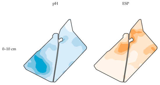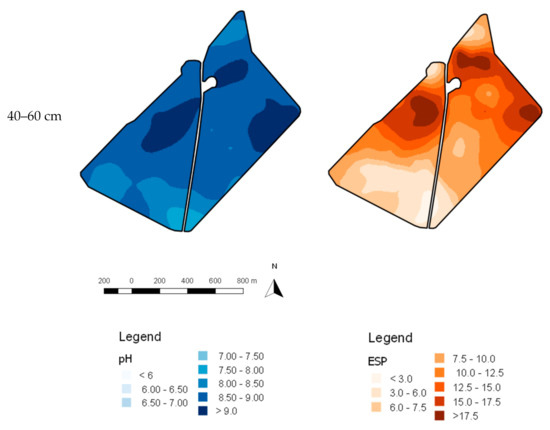 Measured soil pH and ESP maps for the investigation site within the 0–10 cm and 40–60 cm depth layers.