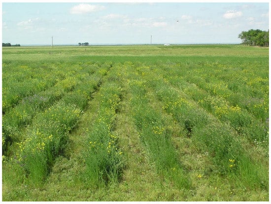 42. Markegard, W.; Duckwitz, W.; Jensen, N. Yellow-Flowered Alfalfa and Cool-Season Grass Mixtures: A Demonstration Planting in Perkins, County, South Dakota; Final Report Demonstration Planting; Bismarck Plant Materials Center: Bismarck, ND, USA, 2018. Available online: www.blogs.nrcs.usda.gov/Intenet/FSE_PLANTMATERIALS/publications/ndpmcsr13320.pdf (accessed on 1 July 2020).