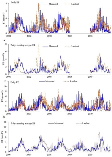 Figure 5a,b presents the northeast irrigated lysimeter daily measured ET, Landsat ET, and seven-day running average from 2001 to 2010. The 1:1 graph between the daily measured and calculated Landsat ET is shown in Figure 6, and the daily and monthly summary statistics are summarized in Table 6. The growing and non-growing season summary statistics are reported in Table 7. The daily 1:1 graph is shown in Figure 6, and the monthly ET is shown in Figure 7.