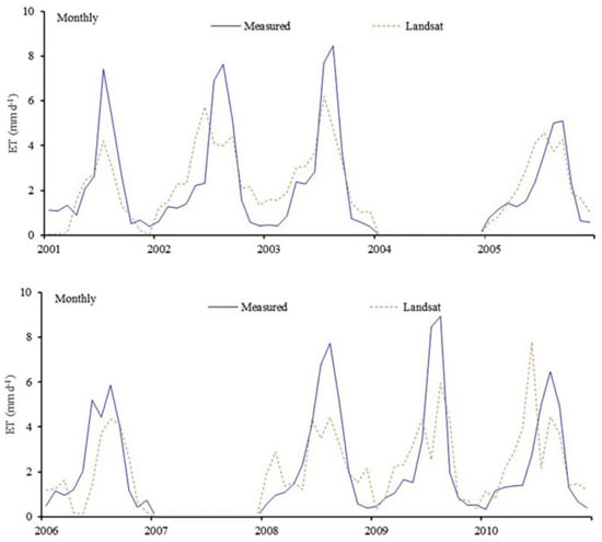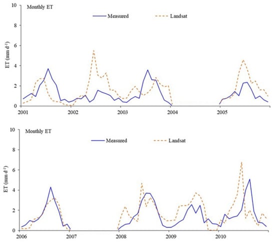 The relationship between measured and Landsat ET for the irrigated lysimeter provided overall better agreement compared to the dryland field [,,,]. The Landsat ET estimates were closely matched most of the year, except the middle of the growing seasons, during the peak crop water requirements. The satellite-based approach underestimated ET toward the middle of the growing season for cotton and soybeans, and overestimated the ET early and late during the growing season.