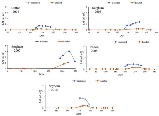 The growing season dryland measured LAI was plotted versus calculated Landsat estimates for the days where Landsat images were available, as shown in Figure 4. It can be clearly seen that the Landsat LAI underestimated the LAI during the study period for all cultivated crops. Dryland conditions in Bushland, TX typically have much less vegetation than irrigated areas. The lower amounts of plant biomass allow the soil background to be more prominent at the Landsat spatial resolution. The increased soil background can skew the reflectance and LAI, causing lower values. Another potential source of errors is due to uncertainties with the remotely sensed datasets under dryland conditions, due to surface roughness length and ET extrapolation methods that have been incorporated in the METRIC model [,,]. Chavez et al. [] reported that the METRIC model estimation error was (0.7 ± 0.9 mm d−1), explaining that the variations were due to errors associated with the surface roughness length and aerodynamic resistance. Another potential source of uncertainties is that the METRIC model uses a SURFACE NDVI vs. LAI relationship, where it is generated by fitting a generalized equation to six LAIs compared to NDVI functions [], defined in the MODIS LAI backup [], indicating a higher source of LAI estimation under dryland conditions.