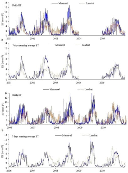 In 2002, 2005, and 2009, the lysimeter field was fallow, and Landsat overestimated ET in each of the three years (Figure 1), and these results agree with Allen et al. []. Cotton was cultivated in 2001 and 2008, and Landsat estimates of ET closely matched the measured ET at the beginning of each year. However, towards the end of 2001, Landsat significantly underestimated ET due to low NDVI values and, consequently, underpredicting LAI []. ET data in 2004 and 2007 were omitted from the analysis, as the Landsat data overestimated the ET compared to the measured ET due to the large gap period in Landsat data and linear interpolation method used to fill the gap. In 2003, when sorghum was cultivated, the satellite-based-ET overestimated measure ET in both the beginning and towards the end of the year, and underestimated towards the middle of the growing season.