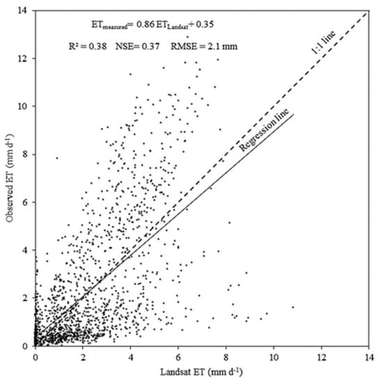 The measured mean ET was 1.3 mm d−1, and the mean Landsat ET was 1.7 mm d−1. Due to the daily ET value deviations, the summary statistics provided a poor match during the comparison period with an R2 value of 0.01, NSE value of −1.38, RMSE of 1.8, and an RMSE error of ~144.3%, which is considered a high error value. These statistical parameters indicated that there was no correlation between measured and calculated values [].