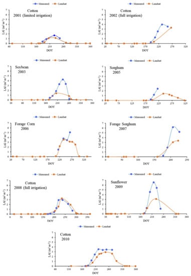 The reason behind this is likely that LAI is better estimated for the irrigated field than the dryland field [,] due to more vegetation coverage, resulting in higher NDVI values and consequently ET values. In 2007 and 2009, when forage sorghum and sunflowers were cultivated, respectively, the LAI estimated using Landsat was slightly lower than the measured LAI for the irrigated lysimeter.