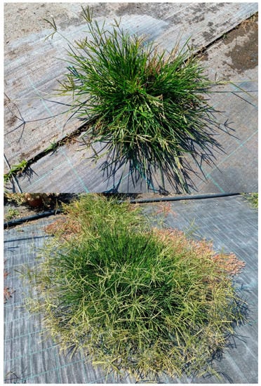 Two dose-response experiments were conducted to evaluate glyphosate efficacy on the biotypes. Herbicide application (Roundup Power 2.0, Monsanto Agricoltura Italia S.p.A., Via Giovanni Spadolini, 5, 20141 Milano, Italy; glyphosate content 360 g ae L−1) was done at the 1–2 tillers or BBCH 21–22 growth stage [37] using a precision bench sprayer with a boom equipped with three flat fan hydraulic nozzles (TeeJet XR11002-VK, Glendale Heights, IL, USA), with a spray volume of 300 L ha−1 applied at a pressure of 215 kPa and speed of 0.75 m s−1. E. indica plants were treated with a range of glyphosate doses (22.5, 45, 90, 180, 360, 720, 1440, 2880 and 5760 g ae ha−1, i.e., from 1/16 to 16 times the recommended label dose of 360 g ae ha−1). Only the putative GR biotype (19-1) was treated with the two highest doses (2880 and 5760 g ae ha−1). Untreated controls were also included for all biotypes. The experimental layout was a completely randomized design with three replicates, i.e., three trays of 15 plants each. Plant survival was evaluated 3 weeks after treatment (3 WAT) and expressed as percentage of the plants counted before the treatment in each tray. Plants showing no active growth were considered as dead. Fresh weight of the above-ground biomass, including both dead and alive plants, was measured for each replicate and expressed as percentage of the mean value of the untreated replicates of the same biotype.