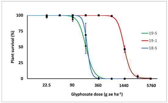 Plant survival response (%) to increasing glyphosate dose of the putative GR biotype (19-1, red line) and the two susceptible reference biotypes (18-S and 19-S, blue and green lines, respectively). Values are the mean of the two experiments, i.e., six replicates. Bars represent standard errors.