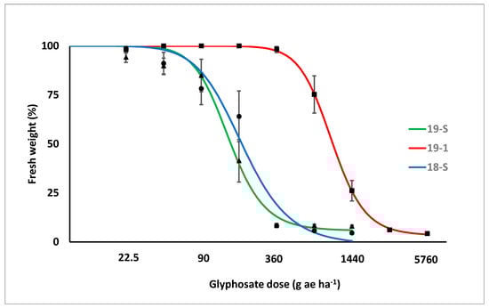 Fresh weight reduction response (expressed as % of the untreated control) to increasing glyphosate dose of the putative glyphosate-resistant (GR) biotype (19-1, red line) and the two susceptible reference biotypes (18-S and 19-S, blue and green lines, respectively). Values are the mean of the two experiments, i.e., six replicates. Bars represent standard errors.