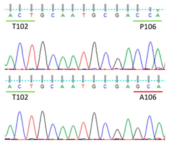 Screenshot of chromatograms obtained from a susceptible plant of 19-S biotype (upper graph) and a resistant plant of biotype 19-1 (bottom graph). Only codons from 102 to 106 are shown.