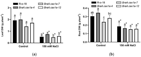 Effect of BraA.cax1a mutations and salinity on leaf dry weight (DW) (a) and root DW (b). Values are expressed as means ± standard error (n = 9). Bars marked with different letters indicate significant differences among genotypes based on the LSD test (p < 0.05). Asterisk (*) indicates significant differences between control and 150 mM NaCl treatments.