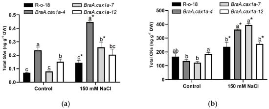 Effect of BraA.cax1a mutations and salinity on total GA (a) and CK (b) concentrations in the leaves. Values are expressed as means ± standard error (n = 9). Bars marked with different letters indicate significant differences among genotypes based on the LSD test (p < 0.05). Asterisk (*) indicates significant differences between control and 150 mM NaCl treatments.