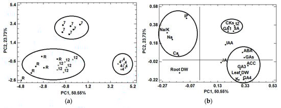 A principal component analysis (PCA) was performed to detect general trends in the data and to evaluate the relationships among parameters. The first principal component (PC1) of the score plot clearly separated BraA.cax1a-4 from the rest of the lines and accounted for 50.55% of the variance within the data. The second principal component (PC2) separated BraA.cax1a-7 from the other lines and accounted for 23.73% of the variance (Figure 3a). The PCA loading plot revealed three clusters (Figure 3b). The first cluster associated leaf DW with K+, GA3, GA4, ACC, GAs, and ABA levels. The second cluster related Na+, Na+/K+ ratio, Ca2+, and iP levels. Finally, the third cluster, grouped tZ, total CK, GA1, and SA concentrations (Figure 3b).