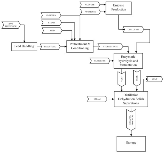 After the feedstock has been received into the facility as corn stover, it is transferred from feedstock storage and handling, with the aid of conveyors for pretreatment and conditioning. This process, through a hydrolysis reaction, involves converting the hemicellulose carbohydrates in the corn stover to sugars [16]. These sugars will be used during the enzymatic hydrolysis stage. The purpose of this conversion is to facilitate the enzymatic hydrolysis by sending only usable extracts form the corn stover for hydrolysis. Residues that are not usable are given off as acetate. Pretreatment is usually carried out in two phases, a horizontal screw-feed reactor and a lower temperature conversion, with a residency time of 5–10 and 20–30 min, respectively. There is no benefit of keeping the corn stover longer than necessary in this stage, since this fermentation process uses ammonia [17]. The ratio of converted product varies across various corn varieties. This paper adopts a 45.4% Glucan, 22.7% Xylan and 1.9% Arabian as the percentage of converted products [18]. This summation sums up to 70% of the total mass of the corn stover. The remaining 30% is given off as acetate or can be utilized for other processes.