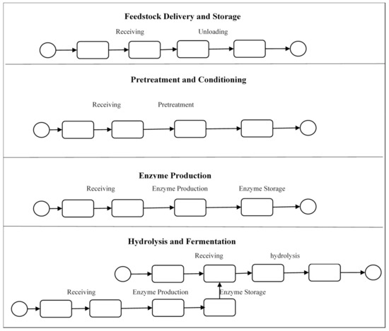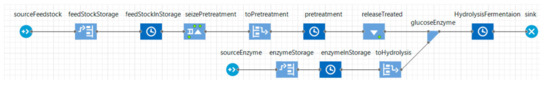 The proposed model is generic so that it can be applied to a biofuel refinery with any type of feedstock. Once the detailed operations or processes of a subject system are analyzed (see Section 2), the subject system can be modeled via the proposed CES under AnyLogic®. This is flexible simulation software used to model numerous production systems [33]. As each refinery must have appropriate capacity for reduction of its operational cost, it is necessary to use the proposed model for the facility design.