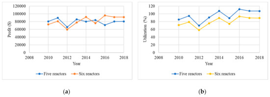 Although the option with five reactors has a higher utilization than another option with six reactors, it requires overproduction in 2014, 2016, 2017, and 2018. In other words, the option with five reactors is not reliable because it cannot handle a case with high yield of corn stover. To make utilization over 100%, a refinery should spend additional operational cost (e.g., extra payment for overtime). Thus, the ratios of production cost to production quantity (USD/L) between two options are quite similar, even though the option with six reactors has a higher fixed cost in its production cost. The ratio of the option with five reactors has 0.8648, and the ratio of the option with six reactors is 0.8700. Since the option with six reactors can produce more ethanol than another option with five reactors, it has a higher daily profit than another scenario. In fact, the NPV of the case with six reactors has the highest value (i.e., USD 291,768,314) so that buying three more reactors will be the best option for the subject facility.