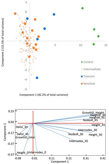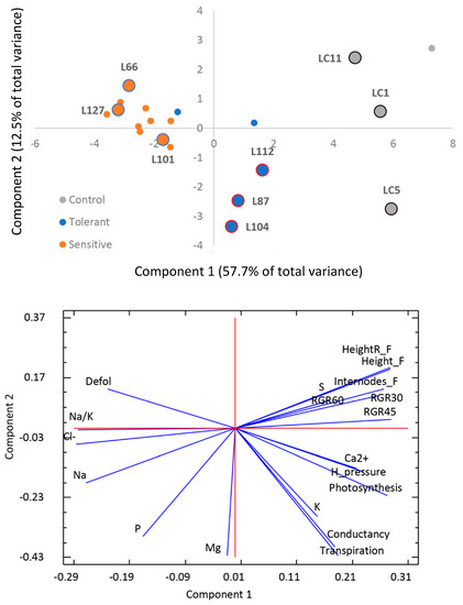 Physiological responses and morphological phenotype between the groups showed greater differences compared to the morphological traits measured, showing a clear separation between the tolerant and sensitive plants as shown in the PCA analysis (Figure 3). The first two components of the analysis explained more than 70% of the variability and a total of 4 principal components were identified with eigenvalue >1 (Supplementary Figure S3). The main differences between groups were both found in the first and second components of the analysis.