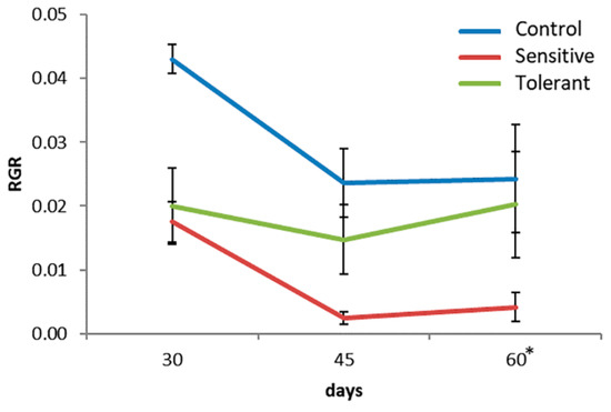 Furthermore, differences between tolerant and sensitive plants were significant for the relative growth rate (RGR) (Figure 2). The sensitive plants showed less RGR than the tolerant ones at the end of the saline treatment (day 60).