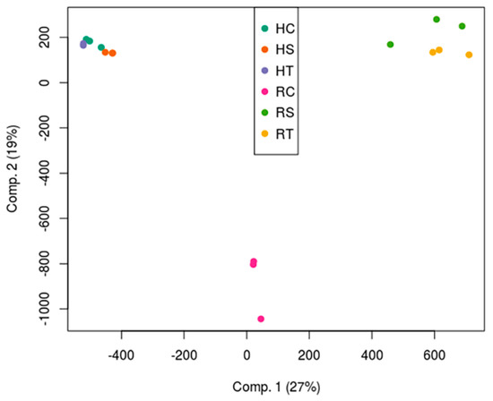 Principal component analysis of the transcriptomes of the samples. HC, HS, and HT refer to control leaves, sensitive leaves, and tolerant leaves, respectively. RC, RS, and RT refer to control roots, sensitive roots, and tolerant roots, respectively.