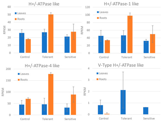 Reads per kilobase of transcript, per million mapped reads (RPKM) values of the differentially expressed H+/ATPase-like genes between control, tolerant, and sensitive groups in leaves and roots. Bars represent standard deviation.