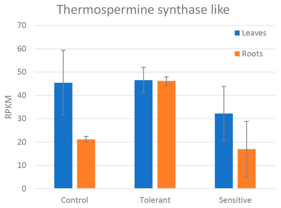 Reads per kilobase of transcript, per million mapped reads (RPKM) values of the differentially expressed thermospermine synthase-like gene between control, tolerant, and sensitive groups in leaves and roots. Bars represent standard deviation.