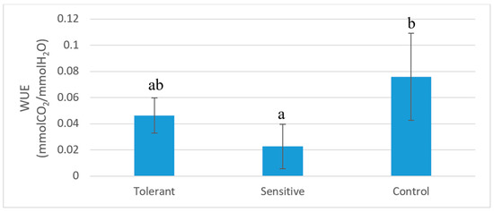 Water use efficiency of tolerant, sensitive, and control plants after 60 days of saline stress. Bars represent standard deviation. Different letters represent significative differences (p < 0.05).