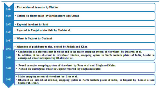 Foremost damage of the pink stem borer was observed in maize during 1914 by Fletcher in India. Afterwards it moved to finger millet, rice and wheat. Later on, the pink stem borer was confounded as a rigorous pest in many crops. The historical perspective of this pest is depicted in Figure 1.