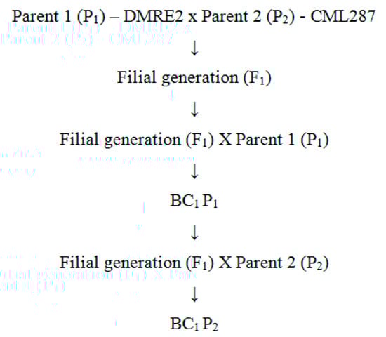 “The prerequisites and criteria in resistant molecular breeding against the target pests are understanding the genomics level of host plant defense and evaluation of the number of responsible genes imparting resistance to a plant-feeding insect pest” [69]. Mather [70] called it as the backbone of Generation Mean Analysis (GMA), developed and promoted the effectiveness of scaling check to recognize and understand the heredity and genetic material underlying quantitative behavior such as insect resistance genes. GMA is a fundamental tool to study the genomics of an organism. GMA was successfully utilized in maize to understand the inheritance of resistance to Mediterranean corn borer (MCB) [71] Furthermore, the heredity of resistance against MCB recommended quantitative inheritance of the trait [71,72]. GMA is specified as a relatively easy and consistent tool [72,73]. Besides, the genetic source of defense mechanism against S. inferens was reported in maize in India. Santosh et al. [74] illustrated that negative additive and dominance effects, and positive additive x dominance (j) and dominance x dominance (l) epistatic interaction affects the management of the S. inferens resistance in maize. The effective inbred line improvement can be accomplished through the association of pedigree breeding coupled with a cyclical breeding procedure (Figure 3). Insect resistance is mainly regulated by additive x additive (i), followed by dominance (d) and additive (a) gene effects. The effects of inbred lines and their reaction to S. inferens were studied in maize [75]. The lines used in the study are depicted in Table 2. In DMRE2 X CML287, epistasis (i, j, and l) was not observed and was insignificant (expression resistant to S. inferens).