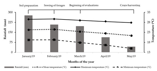 One week before sowing, 1 ton of lime filler was applied by broadcasting and was incorporated into the soil to increase the base saturation to 60%. The forage systems were sown manually on 4 February 2019, with the application of 200 kg ha−1 of P2O5 and 20 kg ha−1 of FTE BR 12 fertilizer (9% Zn, 1.8% B, 0.8% Cu, 2% Mn, 3.5% Fe, and 0.1% Mo), using simple superphosphate and fritted trace elements as sources, respectively.