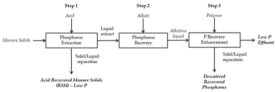 The Quick Wash process includes three steps [16]: Step 1 includes mixing manure with an acid solution to form a homogeneous slurry followed by solid-liquid separation to dewater the slurry. The dewatering of the slurry generates an acid-washed solid residue and an acidic extract rich in soluble P. In step 2, P recovery occurs through precipitation under alkaline conditions by adding liquid lime (Ca (OH)2) to the acidic extract. In step 3, the addition of an organic anionic polymer promotes the P enrichment in the precipitate (Figure 1).