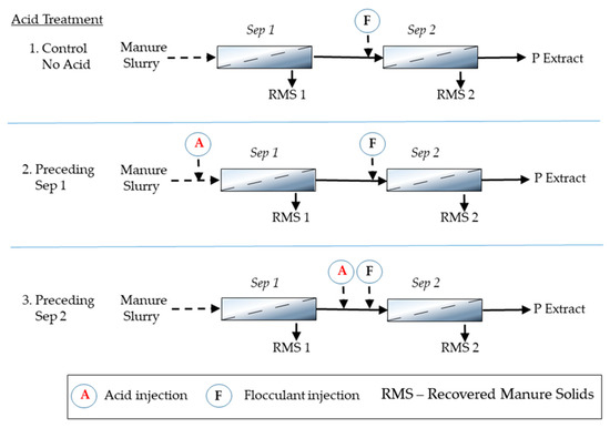 Schematic diagram of the three treatments tested for solids separation of manure using a double-stage stationary separator with two screens Sep 1 (12.7 mm) and Sep 2 (0.25 mm) and alternative points for acid injection for phosphorus (P) extraction.