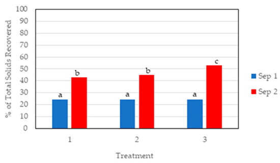 Recovered manure solids using a two-stage solid-liquid separation screen with acid addition. Data are expressed on a dry basis as percentage of initial total solids content of untreated dairy manure slurry. Treatments: (1) no acidification (control), (2) acid added before Sep 1 (12.7 mm screen), and (3) acid added before Sep 2 (0.25 mm screen). Bars represent the mean of duplicate tests. Means with the same letter (a, b, or c) are not significantly different according to LSD0.05.