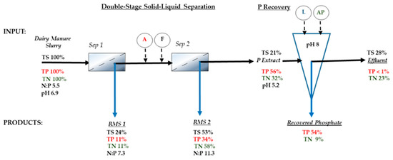 In the US, the large amount of manure produced by dairy operations (18.9 Tg per year) is as big as the total manure from feedlot beef and confined swine production combined [1]. When adequately applied to farm fields, dairy manure is a valuable source of nutrients for crop production. Federal and state regulations require confined dairy operations to implement a comprehensive nutrient management plan to land apply manure nutrients [2]. Usually, the nutrient management plans prescribe manure applications based on a crop’s N requirement. However, repeated land application of dairy manure can increase the amount of soil P above crop requirements because of the imbalance of N and P content (N:P ratio) in manure and harvested crops [3,4]. The N:P ratio in plant biomass of most grain and hay crops is 8:1 against manures that usually have a smaller N:P ratio of less than 4:1 [5,6]. Therefore, an excessive soil P build-up can lead to soil P losses through leaching and runoff and impairment of water quality in lakes and rivers [4,7]. Besides, P pollution accelerates algal blooms in drinking water sources, drastically increasing treatment costs and shortages in potable water supplies [8]. Nevertheless, dairy production operators are interested in alternative manure management systems to both reduce the environmental impact of land spreading and recover value from manure and its byproducts [9,10].