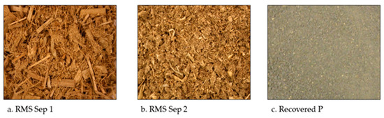 Recovered manure solids (RMS) from Sep 1 (>12.7 mm), Sep 2 (12.5 mm–0.25 mm), and recovered phosphate material (>0.25 mm).
