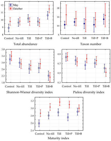The Maturity Index also was greater in October, mainly due to an increase in omnivore/predators (Figure 2). The application of No-till technology did not affect the nematode community’s synecological characteristics compared to Control (GLM planned comparison, F = 1.34, p = 0.28). However, some synecological indicators were sensitive to this impact. Thus, No-till technology led to a reduction of the Pielou index, to an increase of the Matrix index, and to an increase in the role of the trophic structure of herbivores. Till treatment did not significantly impact synecological indicators (GLM planned comparison, F = 2.28, p = 0.06). However, it led to a decrease in the Shannon diversity index, mainly due to the evenness of the abundance of nematode families, rather than the number of families, as indicated by a consistent decrease in the Pielou index. The decrease in abundance evenness of families occurred against the background of increasing in the total community size. This increase in community size was due to the growth of a limited number of nematode families that belonged to the herbivores trophic group.