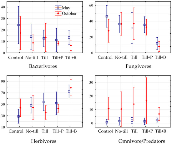 Compared with reduced till and no-till systems, conventional tillage reduced the number of protozoa, bacterivores, and omnivore–carnivores [39,45]. This result can be explained by a shift from a bacteria-based food web to a fungal one following soil disturbance [46]. On the contrary, de Geode et al. [47], Darby et al. [48], Zhao and Neher [49] found that tillage practices along with other soil disturbance and application of mineral fertilizers increased fast-growing bacterivore nematodes. The application of soil amendments likely promotes the shift to bacterivores. Wang et al. [50] and Okada et al. [51] showed greater nematode abundance with increased fungivore, bacterivore, and omnivore populations in the soil of tilled plots with the application of synthetic and organic fertilizers compared to tilled plots without amendments. Lenz and Eisenbeis [52] detected that ecological diversity indices: MI and Plant-Parasitic Index (PPI) are suitable indicators of tillage impact on the nematode community. The Nematode Trophic Diversity (TD) did not respond to tillage disturbance; however, the MI was suitable for indicating immediate tillage effects on the nematode community.