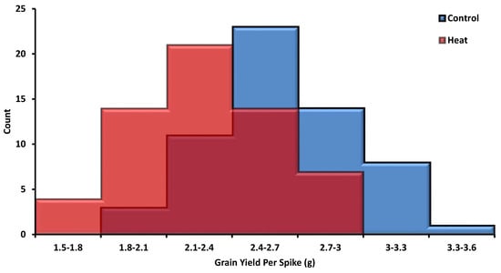 The distribution of the grain yield per spike (GYPS) under control and heat stress during pre-anthesis in barley.