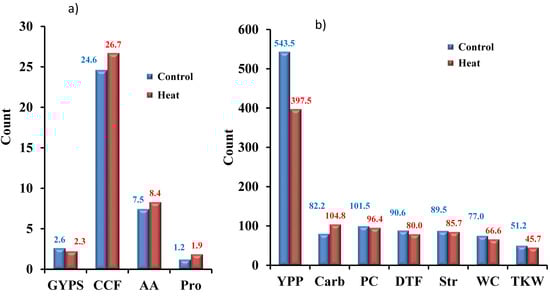 The histograms show the yield-related traits and the physiological traits in barley under control and heat stress during pre-anthesis in barley. Traits were grouped based on the range of their values; (a) traits with values less than 50 and (b) traits with values more than 50. The analysis of variation for yield traits (yield per plot (YPP), GYPS, and thousand kernel weight (TKW)) was fully described previously by Sallam et al. [].