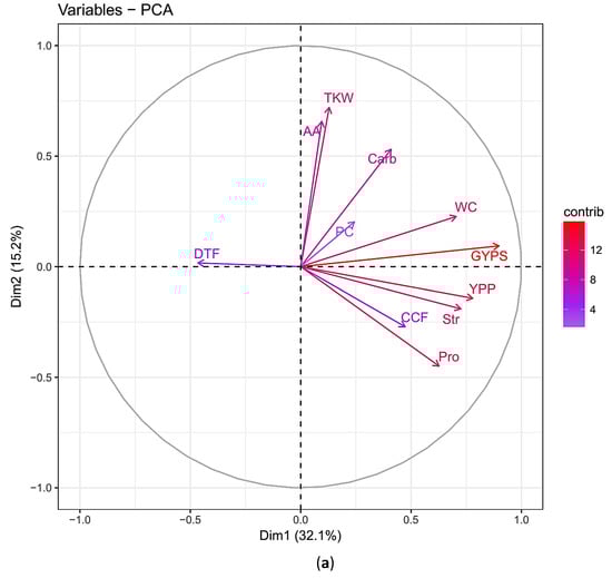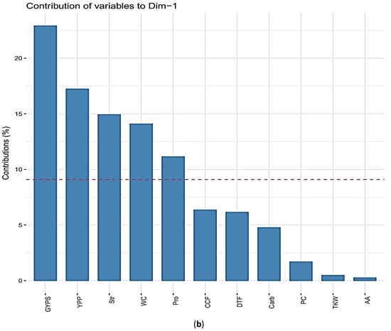 The principal component analysis (PCA) revealed that the positively correlated traits grouped together at dimension 1 (GYPS, YPP, TKW, Str, Pro, WC), whilst the negatively correlated trait (DTF) located at the opposite position. Both dimensions of PCA explained 47.3% of the variation presented in this collection (Figure 3a). The percentage contributions of the significant traits in the variation in the biplot dimension 1 were 22.9%, 17.2%, 14.9%, 14.0%, and 11.1% for GYPS, YPP, WC, Str, and Pro, respectively (Figure 3b). Accordingly, the GYPS was considered as a classification parameter. Based on the percentage reduction in GYPS, the genotypes were classified into four classes, namely A, B, C, and D (described below).