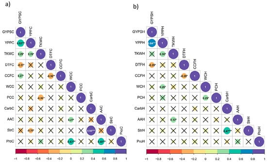 Under heat stress, on the other hand, the magnitude of correlations decreased or became non-significant. There was a positive and significant correlation between GYPSH and YPPH (r = 0.64***). For physiological traits, significant correlations were found between StrH and CarbH (r = 0.47***), WCH and YPPH (r = 0.26*), and WCH and PCH with r = 0.29* (Figure 4b).