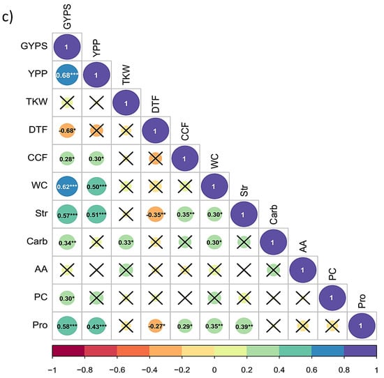 Under control conditions for the yield-related traits, the correlations were positive and significant between GYPS and YPP with r = 0.52**, GYPS and TKW with r = 0.29*, and negative and significant between GYPS and DTF with r = −0.31*. For the physiological traits, all the significant correlations were positive, and the highest was observed between Str and Carb with r = 0.94*** (Figure 4a). Among the yield-related traits and the physiological traits, CCF was significantly correlated with GYPS (r = 0.27*), and DTF (r = −0.36**). Unexpectedly, Str negatively and significantly correlated with YPP with r = −0.25*.