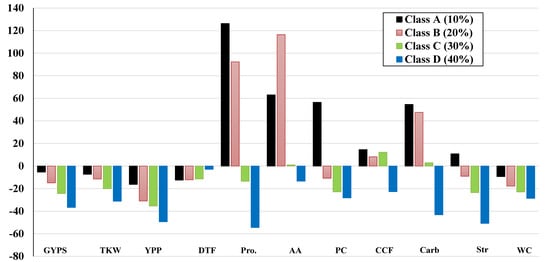 In the four classes, yield-related traits substantially decreased under heat stress (Figure 2a,b). Noteworthily, class A had the lowest reduction in all parameters except for DTF. Class A had the highest reduction in DTF, which is a positive sign for avoiding heat stress by maturing earlier than the other classes (Table 3). Contrarily, the physiological traits such as CCF, WC, Str, Carb, AA, PC, and Pro did not show a regular pattern in the four classes. For example, in class A, there was a clear increase in all physiological traits under heat stress except for leaf water content. In contrast, all of them remarkably decreased in class D (Table 3). However, for the remaining classes, the physiological traits changed inconsistently in each class, as some parameters increased, and the others decreased (Table 3).