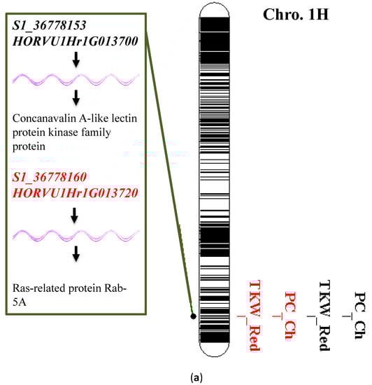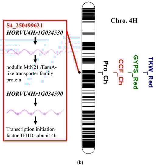 The single-marker analysis (SMA) resulted in 88 significant associations between the genetic markers (SNPs, i.e., single marker polymorphisms) and the traits of interest (Table S2). The significant SNPs are distributed across the seven chromosomes of barley: 1H (10), 2H (16), 3H (11), 4H (17), 5H (13), 6H (16), and 7H (5). The highest number of significant SNPs for a trait was for changes in PC, with 32 SNP markers, and the lowest number was one SNP marker each for a reduction in TKW, reduction in GYPS, and changes in AA. Among the 88 detected significant SNPs, three markers were associated with the variation in more than one trait in a pleiotropic manner. Interestingly, on 1H, two SNP markers, S1_36778153 and S1_36778160, controlled the variation of the changes in PC and reduction in TKW under heat stress (Table 4 and Figure 6a). Additionally, the marker S4_250499621 that was mapped on 4H at 250499621pb controlled the changes in Pro, GYPS, CCF, and TKW (Figure 6b).