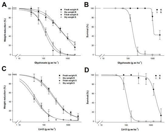 Dose–response curves in % reduction in fresh and dry weight (A,C) and % survival (B,D) treated with different doses of glyphosate and 2,4-D, respectively, expressed as a percentage of the mean of the untreated control of the R and S populations of C. acanthoides. Vertical bars represent the standard error of the mean (n = 10).