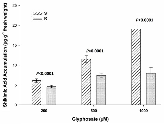 Shikimic acid accumulation was found to be significantly higher in S plants than in R plants (Figure 3). In our study, S population C. acanthoides plants showed shikimate accumulations more than 4 times higher than those found in R plants, which is consistent with the results obtained in previous experiments using whole plants. These results showed resistance to glyphosate, as has been shown in different dicotyledonous weeds. This difference between the R and S populations could indicate that glyphosate reached its target site (EPSPS) differently [,].