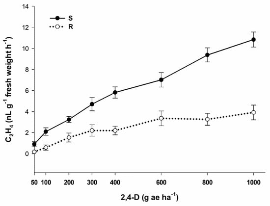 For our study, population S accumulated 2.7 times more ethylene than the resistant population. The differences in the accumulation of ethylene by the susceptible population fluctuated exponentially with respect to the increase in the rate, while resistant population accumulation was constant. These results could indicate the existence of non-target site resistance mechanisms (NTSR), such as reduced translocation and recently shown 2,4-D metabolism, in different dicotyledonous species [,,].