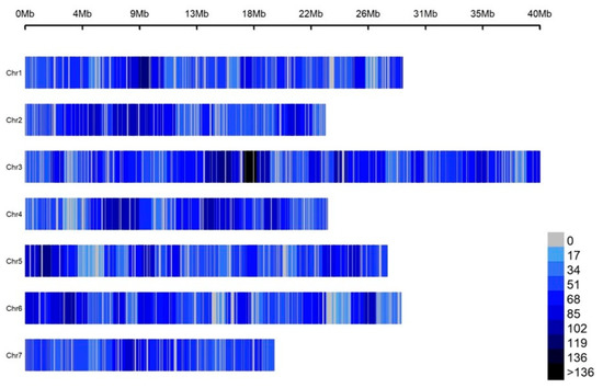 The GBS data were aligned to the genome sequence of Cucumis sativus L. var. sativus cv. 9930 [11]. The GBS genotyping of 264 accessions generated 947,205 SNPs after trimming a quality score of <30 (Table S2). The filtering of those SNPs with criteria of excluding the mono or the tri-allelic SNPs types, which included MAF > 0.05, SNP coverage > 0.6, and IF > 0.8, resulted in a set of 12,082 high-quality SNPs, which were evenly distributed on 7 chromosomes (Figure 1 and Table S2). Each SNP marker was named according to its physical position in the cucumber reference genome.